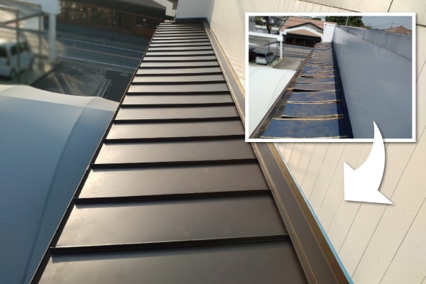 下屋根・庇は、見落としがちだが雨水侵入、雨漏れの主要原因のひとつ。高強度・高耐久性ガルバリウム鋼鈑で葺き替え